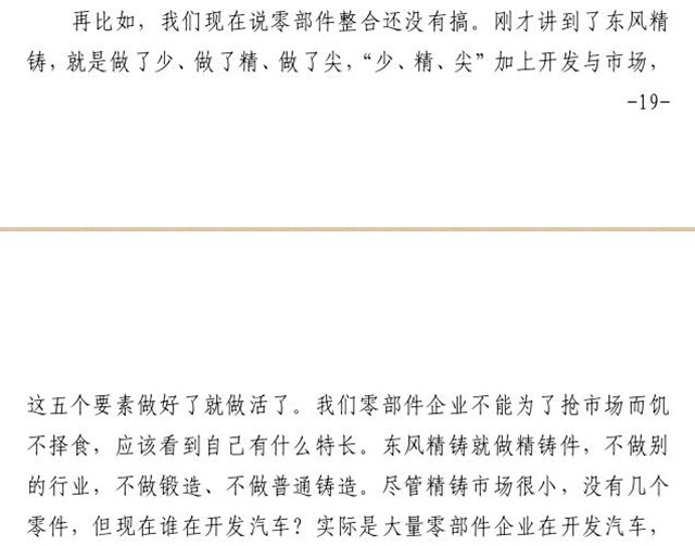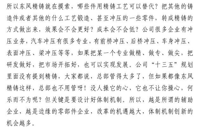 在2016年7月23日東風(fēng)汽車公司2016年年中工作會上,東風(fēng)汽車公司董事長、黨委書記竺延風(fēng)同志對東風(fēng)精鑄改革與經(jīng)營管理等方面的做法給予了充分肯定,要求東風(fēng)公司相關(guān)單位予以借鑒,并深入推進(jìn)各單位改革與創(chuàng)新工作。